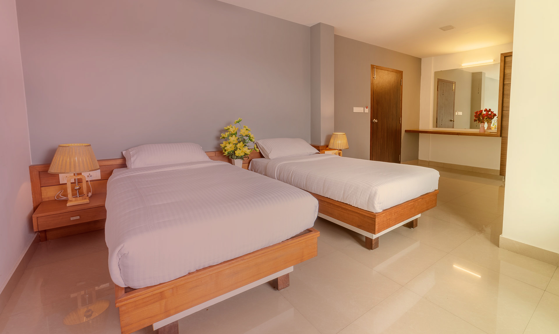 A company with gives a better experience in any engagements. A best option for lodging together is our deluxe twin bedrooms. It avails all the facilities that of royal suits with lesser price, which is royal itself. There are two separate cots provided in the room.